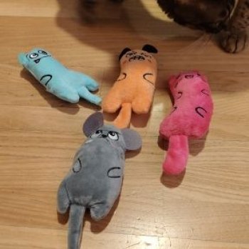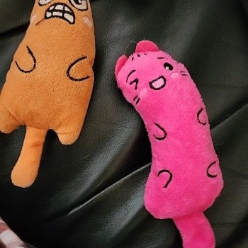 My cat is obsessed with these. Got the orange "mad dog" is what I named him and my cat hunts and fetches it everyday. (I hide it around so she can find it) She nearly chewed the ears off! The pink one is new to her and she fell in love instantly and welcomed her to the toy family. This pink one I named "Pinky Winky" and has a crinkle noise inside. The orange one has catnip inside. Im ordering the rest of the gang for my cat!